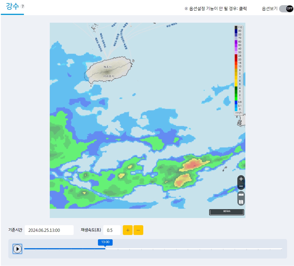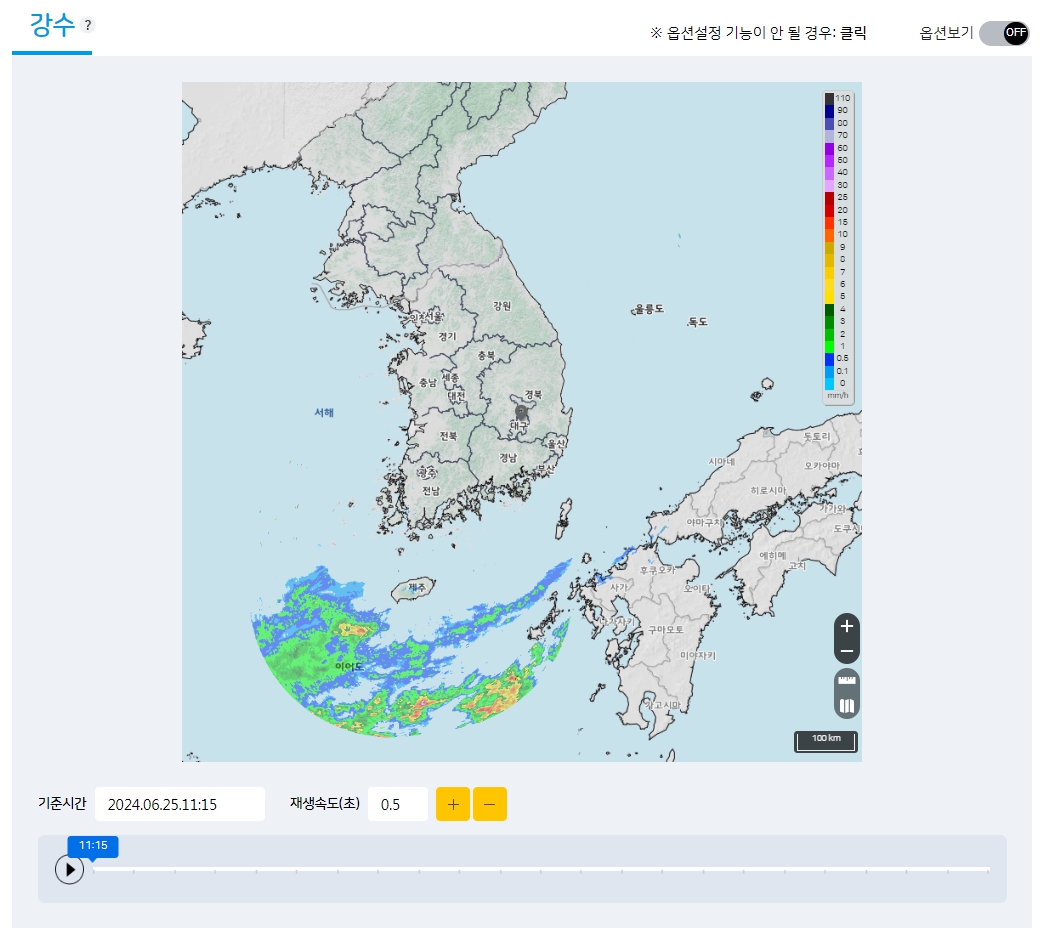 기상청 날씨누리에서는 지역별로 실시간 강수 레이더영상 정보를 제공해주기 때문에, 현재와 가까운 미래를 10분단위로 6시간후까지 강수영역을 쉽게 예측할 수 있답니다.